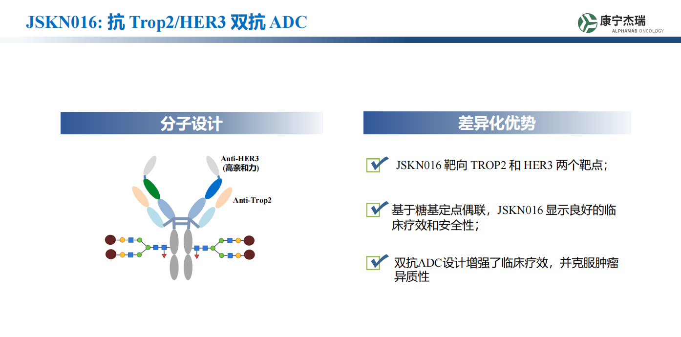 康宁杰瑞全球首创的TROP2/HER3双抗ADC分子JSKN016通过TROP2和HER3双靶点协同(TROP2抗体和SG 、264一样的hRS7抗体结构加上HER3抗体的高亲和力单域抗体设计),糖基定点偶联技术和DAR4的结构设计对安全性的加持,完美的达成了1+1=2的效果。