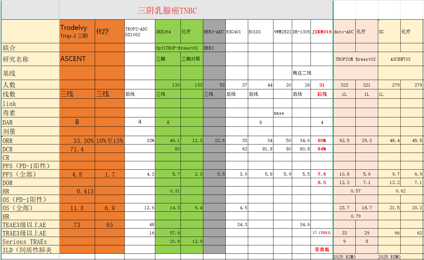 三阴乳腺癌后线的ORR,JSKN016 是64.5%,而264是45.4%,吉利德SG是33%,第一三公的dato是33%,第一三共的HER3-ADC是22%。