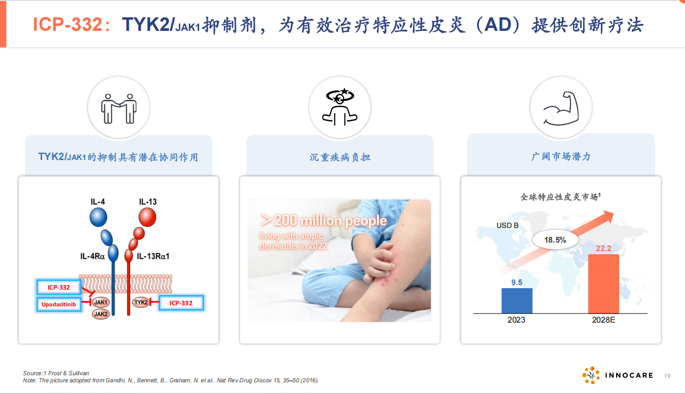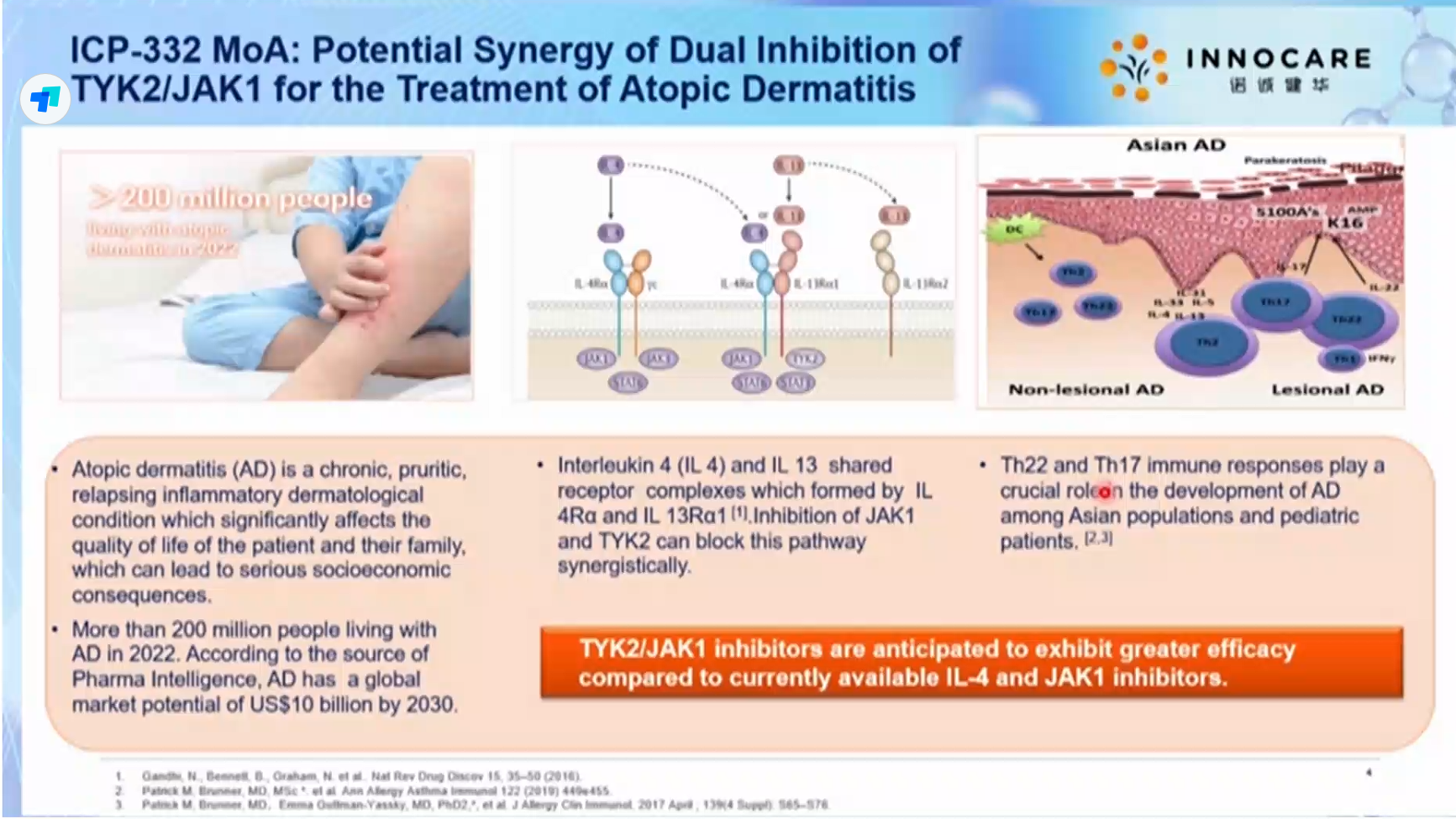 总结一点,就是对于AD的治疗,Th2通路的IL4R靶点的度普利尤单抗是核心因子,这个方面332通过JAK1和TYK2可以起到效果。另外Th17通路,332通过TYK2来阻断IL23通路,因此332从机制来说,可能具有更好的疗效和安全性。