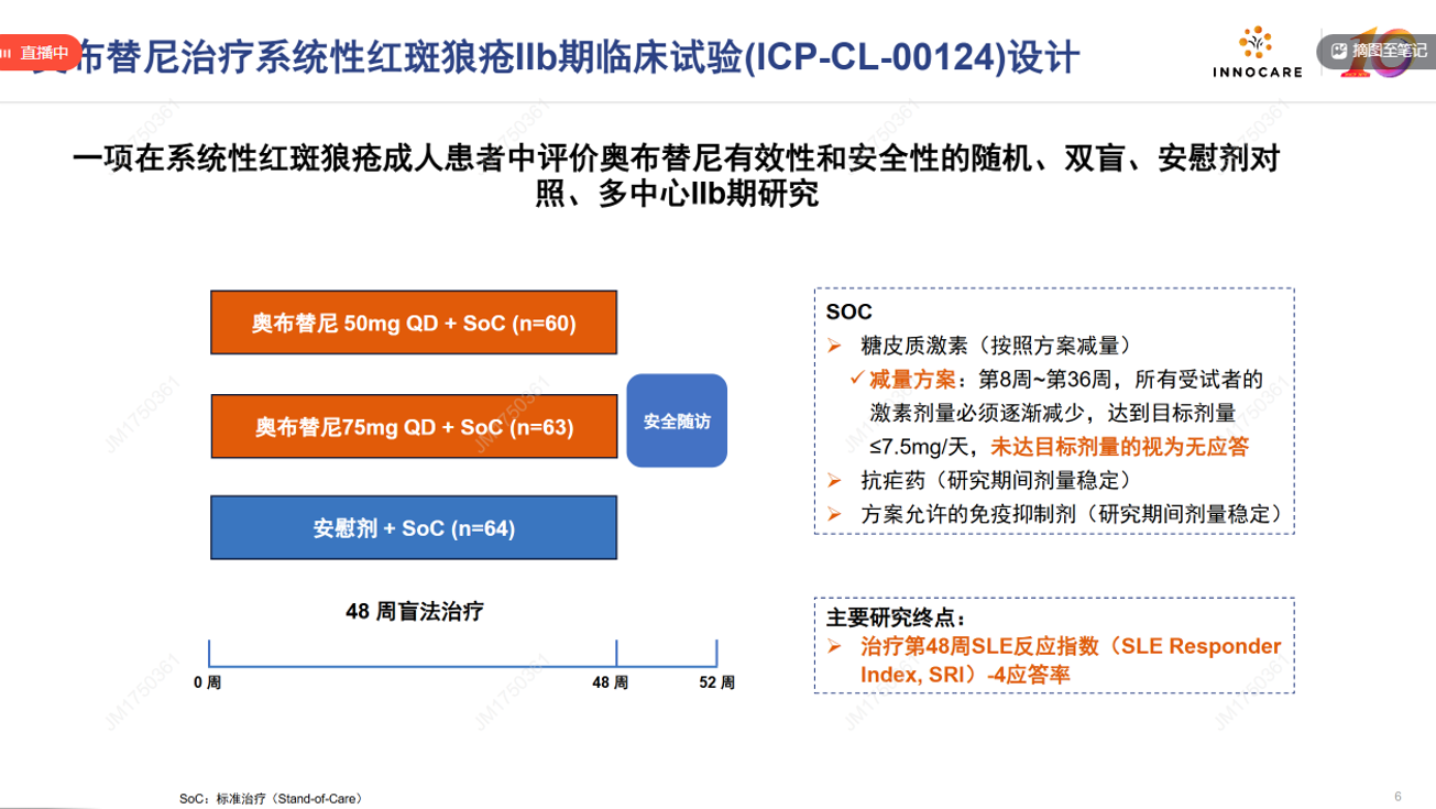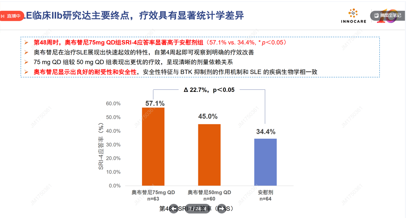 奥布替尼的优势,一方面本身靶点分子占有率高,50毫克以上达到24小时100%的占有,另外就是IIb的SLE作为双终点严格设定都成功了,第48周时的SLE反应指数-4(SRI-4)应答率(第8周~第36周,所有受试者的激素剂量必须逐渐减少,达到目标剂量≤7.5mg/天,未达目标剂量的视为无应答)。