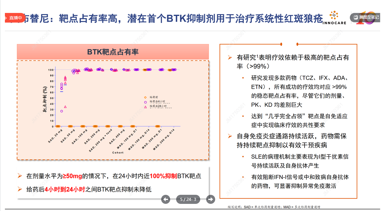 其他的BTK在系统性红斑狼疮SLE都失败了,而诺诚公布的IIb数据在75毫克是成功的阳性结果,为什么呢?因为自免要求持续靶点占有,奥布替尼50mg以上可以100%靶点占有持续24h,是区别于其他BTK分子最大的特点,而三期临床RP3D的75毫克剂量靶点占用更高,疗效更好。
