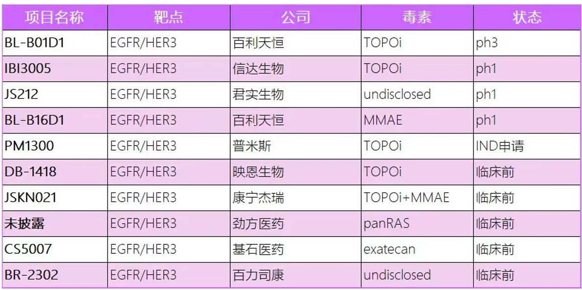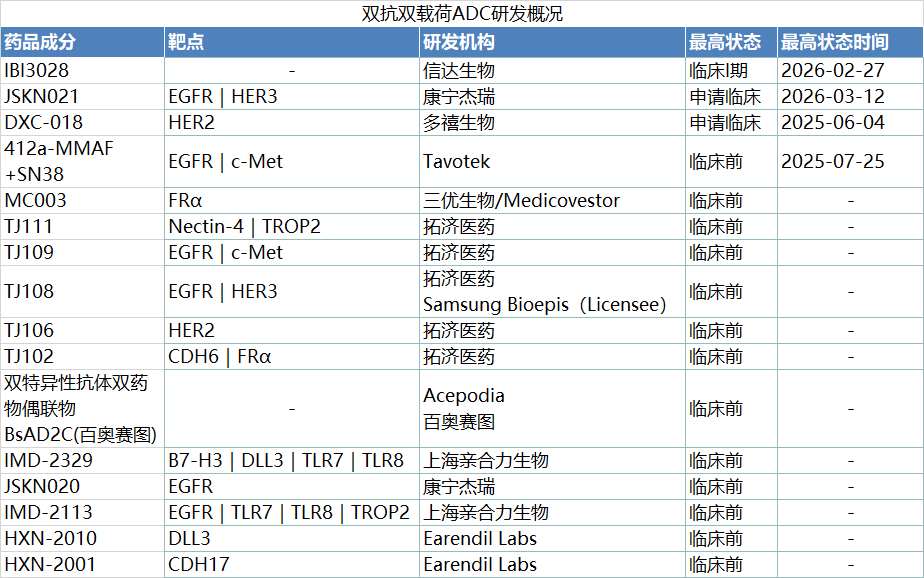 下面这个表来自于猎药人俱乐部整理的双抗双毒素ADC的分子进展情况。信达3028靶点不清楚,多禧的那个去年6月进入临床申报,但是一直没有批准,应该是在补充资料中。