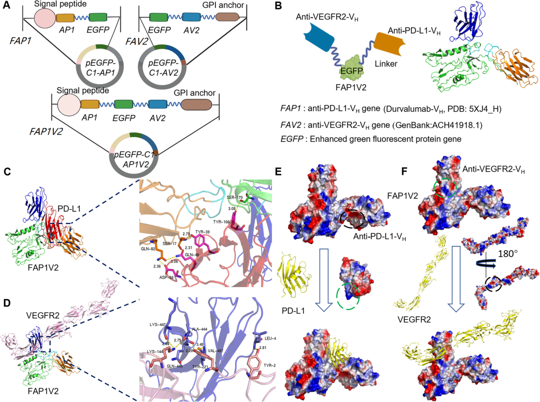 •结构优化:通过柔性连接肽(GGGGS)串联抗PD-L1 VH(FAP1)与抗VEGFR2 VH(FAV2),中间融合EGFP作为示踪标记,N端添加IL-2信号肽、C端连接GPI锚定序列,确保抗体在细胞内精准定位并发挥作用;
