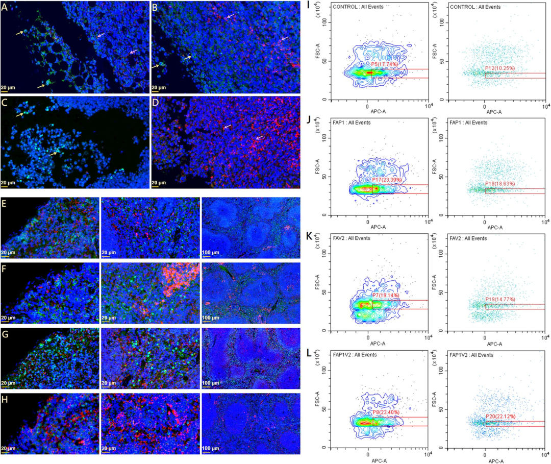 •图3:FAP1V2在小鼠模型中的肿瘤抑制效果:H图为肿瘤生长曲线,显示FAP1V2组肿瘤体积显著小于对照组、FAP1组与FAV2组;I图为实验终点剥离的肿瘤实物图,直观呈现FAP1V2对肿瘤生长的强效抑制作用,二次接种肿瘤的抑制效果更显著。
