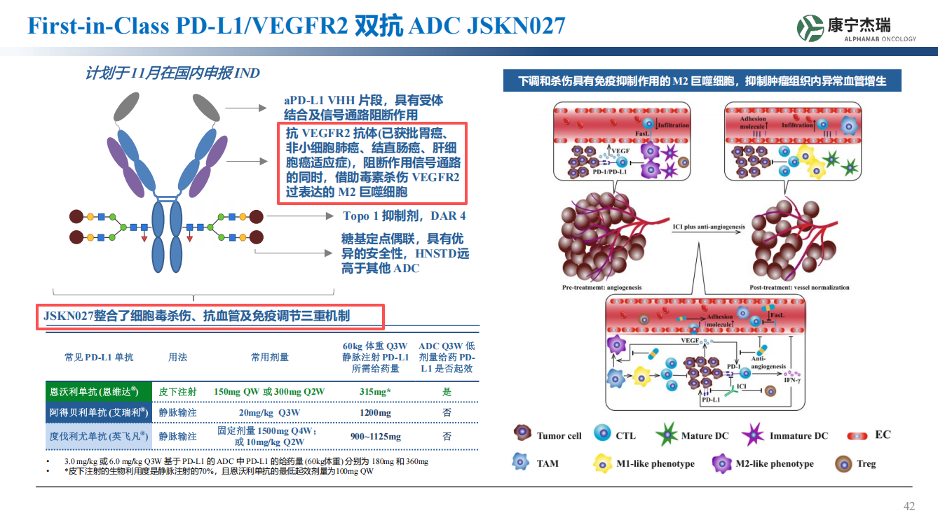 $康宁杰瑞制药-B(09966)$ $康方生物(09926)$ 转发一篇公众号的文章,说明“双靶点纳米抗体新突破!同时阻断PD-L1与VEGFR2,激活长效抗癌免疫+抑制转移”,过去的文章都写的不够详细,这个文章写得非常详细,大家可以参考这个文章,对于理解康宁杰瑞的JSKN027的PD-L1和VEGFR2双靶点ADC更有帮助,而康方生物的AK112的靶点是PD-1和VEGF,一个是作用在免疫细胞,一个作用在抗血管的因子,康方生物和康宁杰瑞的作用的方向不一样,康方是一个配体,而康宁是受体。因为是作用于肿瘤的受体上,所以康宁杰瑞在这个文章提到的双抗基础上,又进一步进行了升级做成了双抗ADC,加上了毒素拓扑异构酶抑制剂Dxd的细胞毒性的化疗功能,这样就具有细胞毒杀伤+抗血管生成+免疫调节三个功能了,可以说是结合了三个功能的IO2.0+ADC2.0的一步到位功能。