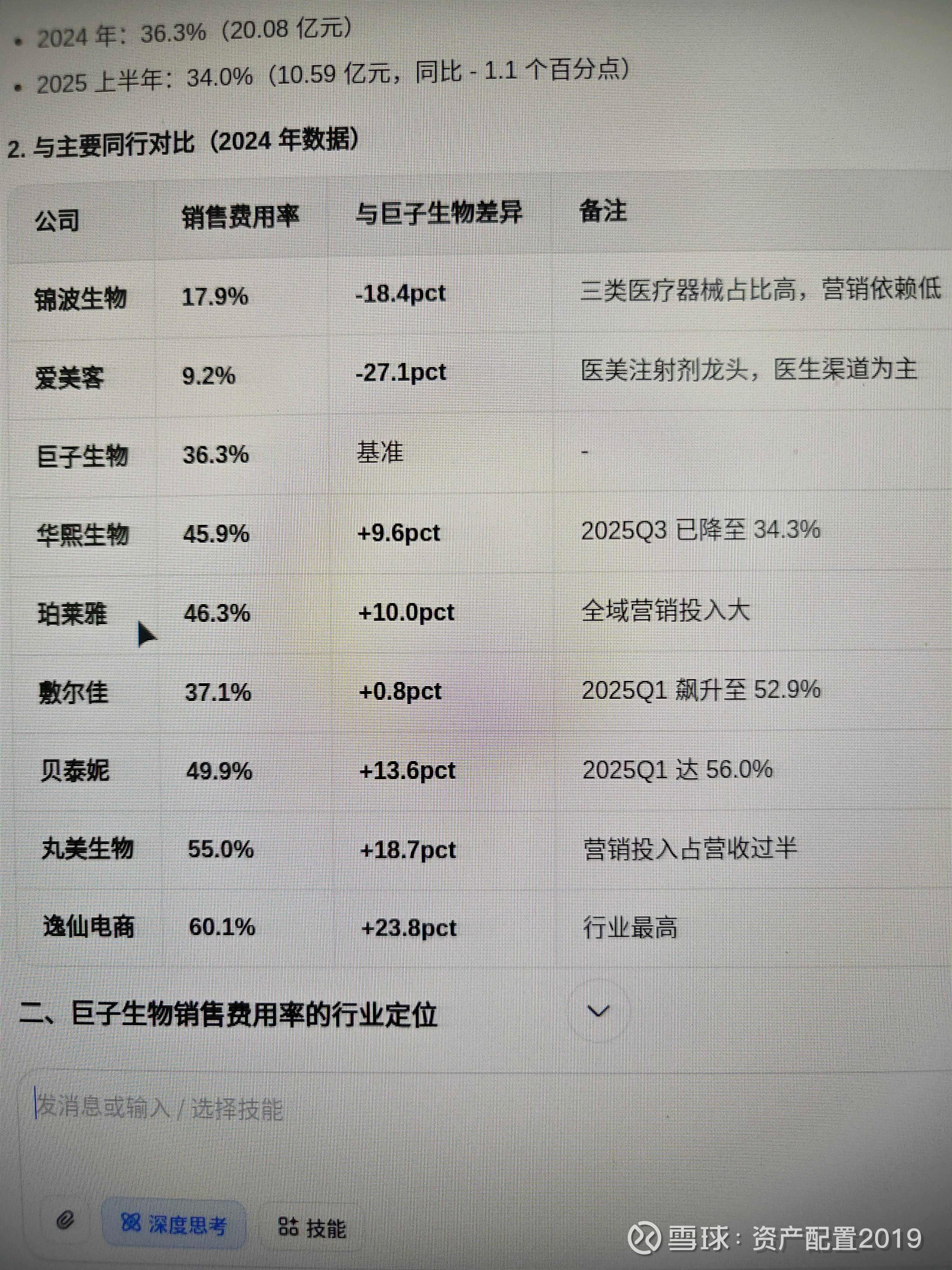 回复@马上牛2024: 巨子生物为什么要逐年增加销售费用?无非是抓住网络直播带货这种销售模式,线上直销占比从2020年不足10%激增至2025年上半年的72.4%,销售费用率从2020年的13.31%升至2024年的36.26%。从最近的报表来看,巨子已经在转型了,从单一头部到“超头部+中腰部+自播”的矩阵模式,销售费用率有望稳下来。其实巨子的销售费用率和同行比,属于中等偏下水平,明显优于多数同行。查看图片//@马上牛2024:回复@慢慢变富的践行者:销售费用从 2020 年的1.58 亿元飙升至 2024 年的20.08 亿元,4 年增长 12.7 倍,远超营收 4.7 倍的增速销售费用率从 2020 年的 13.31% 升至 2024 年的 36.26%,累计上升 22.95 个百分点,直接侵蚀净利率。