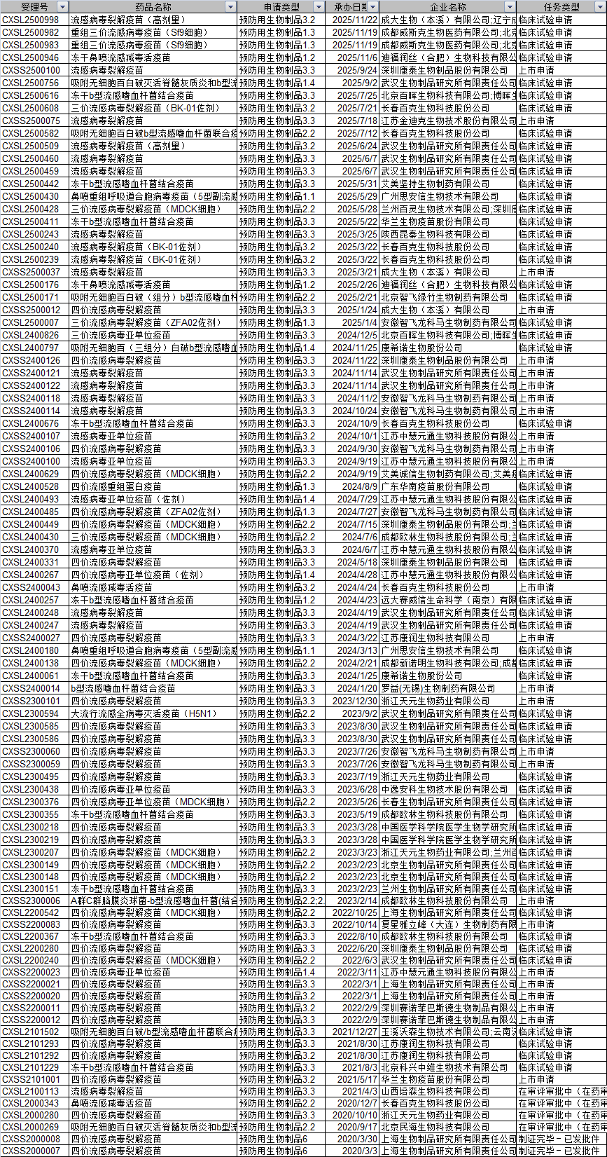 搜索了最近5年,所有流感疫苗申报情况,基本还是以裂解疫苗为主。