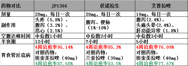 ①JP1366(即扎斯塔普雷赞),PK 第三代PPI埃索美拉唑,4周治愈率95.14% PK 87.68%,效果好,且优于埃索美拉唑。