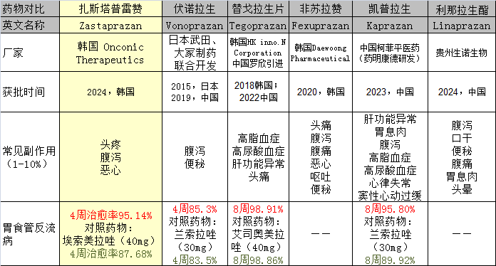 目前全球上市的P-CAB共有7个,第一个上市的、由韩国 Yuhan Corporation研发的瑞伐拉赞几乎消失了,不做比较。剩下的6个,各渠道查阅说明书,情况如下:(非苏拉赞、利那拉生赞未查到说明书,只从其他渠道查到副反应)。