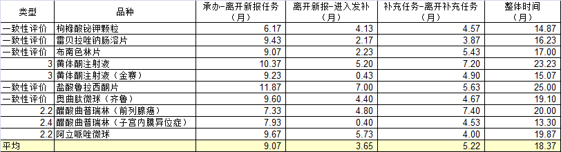 从审评情况可以看到,从递交上市申请,到获批,最快的接近15个月(曲普瑞林为新增适应症,耗费13.3个月),最慢的达到25个月。平均时间为18.37个月(不含曲普瑞林新适应症为18.93个月)。