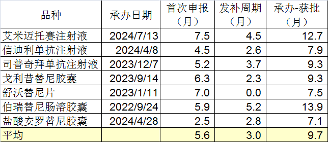 随机统计的7个品种中:首次申报平均5.6个月,发补审评平均3个月(舒沃替尼一次过、未发布),从药审部门承办到获批,平均9.7个月。对比普通审评的18.93个月,节约了大概一半的时间。