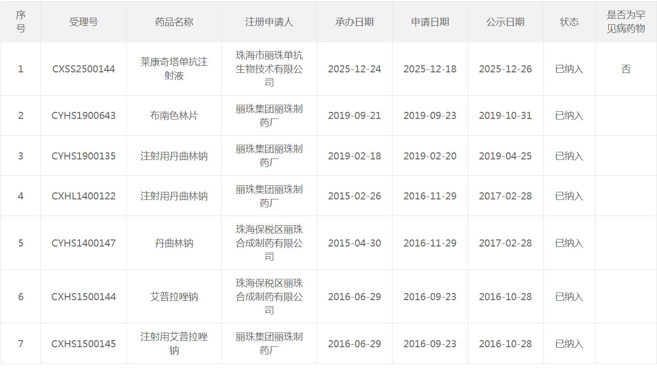 丽珠莱康奇塔单抗注射液的受理号:CXSS2500144。