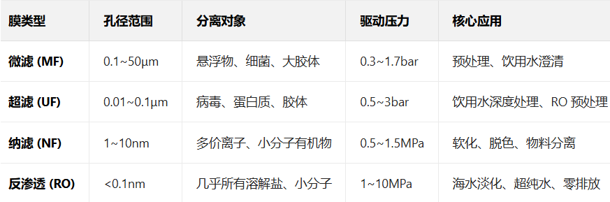 细分,膜材料又分为膜片、膜元件。①膜片是指 以高分子树脂(如 聚酰胺)为核心,通过涂覆、相转化等工艺制成的薄片状膜材料(厚度通常几十至几百微米),具备分离 / 过滤的核心功能。②膜元件是指将膜片与支撑层、导流层、中心管等配件贴合,通过卷制、封装工艺制成的标准化、可独立使用的膜产品单元。③多支膜元件+压力容器+布水/集水配件+管路/阀门,构成膜组件。