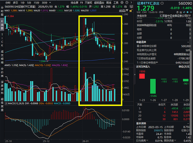 1月30日,A股市场震荡回调,证券ETF汇添富(560090)跌1.46%。