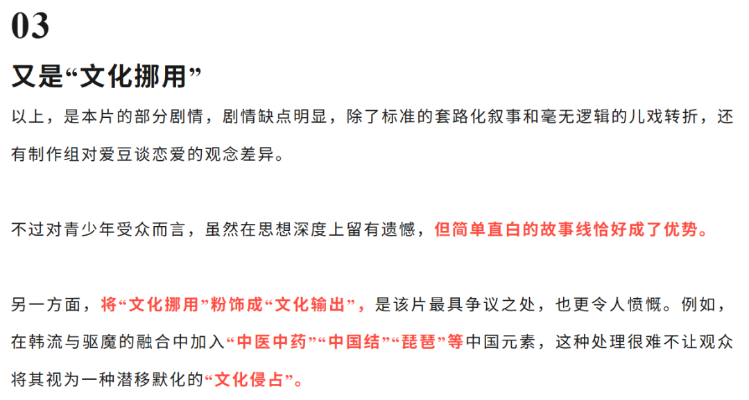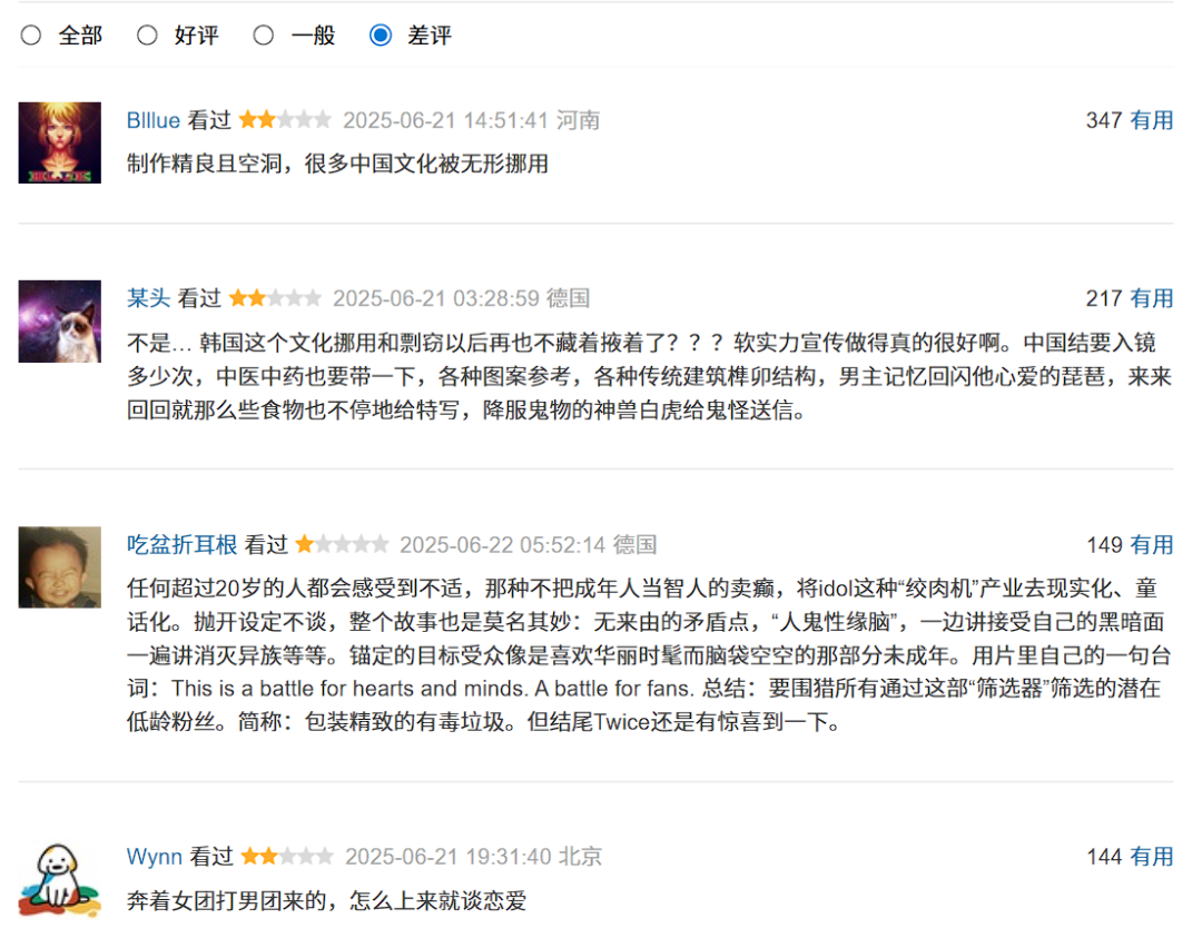 另一方面,中国大陆的受众态度却称得上“耐人寻味”。在豆瓣上,关于《猎魔女团》的评论近万条,一些用户批评动画中使用“传统中国结”,并质疑“为什么在一部典型的韩国电影中加入中国文化元素”。