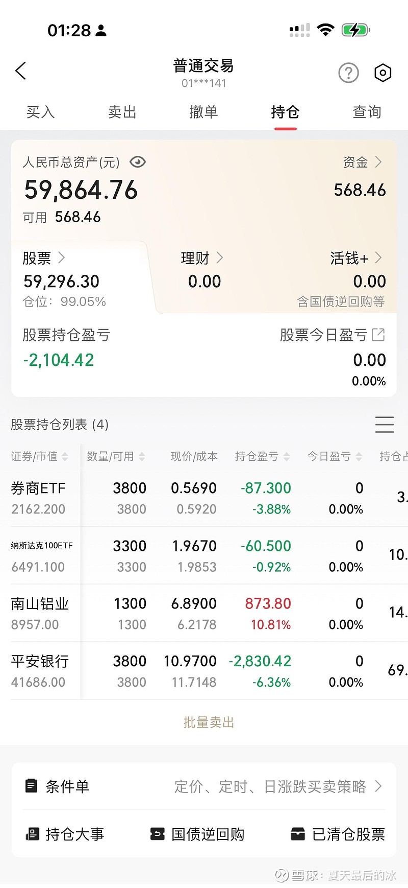 总结:我现在需要让我的账户“活”起来,要有现金流支撑我去做别的票,然后用别的票所盈利的小仓位买入平银。因为避险资产是让我在大a活下去的,不是让我从中谋取暴利的东西—这就意味着它可以被其他避险资产替换,可以适当的减少它的仓位以及阶段性利用它。