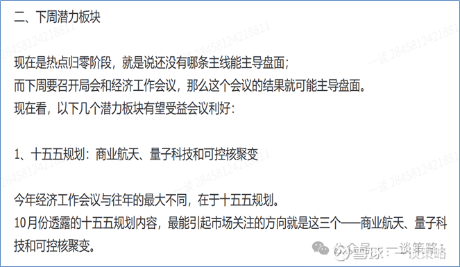 粗看了一下对外发布的内容,没看到特别突出的新亮点,不过现在还不能下结论,因为真正的重头戏在接下来的经济工作会议,按照以往规律,本周应该就能看到结果。