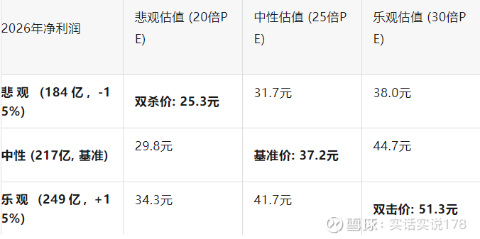 向上看:如果业绩达到乐观预期(249亿),并且宏观因子修复,给30倍PE(51.3元),是现在的价格。如果再叠加2027年业绩(机构看270-280亿),股价看到70-80元,我觉得是大概率事件。