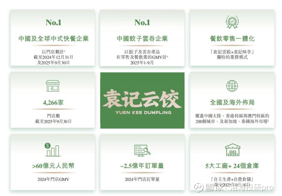 截至2025年9月底,袁记云饺的门店总数达4266家,门店网络覆盖全国32个省份、自治区、特别行政区及直辖市,遍布超过200个城市。根据灼识咨询的资料,按门店数量计算,袁记云饺是中国及全球最大的中式快餐企业。