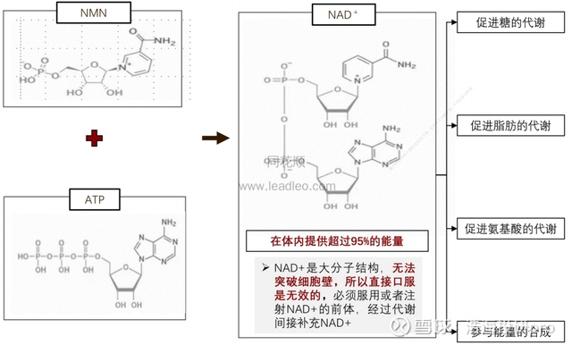 NMN是β-烟酰胺单核苷酸这种有机化合物的简称,是烟酰胺腺嘌呤二核苷酸(NAD+)的直接前体。NAD+被认为是人体所需的一种重要辅酶,其在人体内的水平会随年龄下降,被认为和细胞衰老密切相关,这是NMN被捧上抗衰老神坛的主要原因。