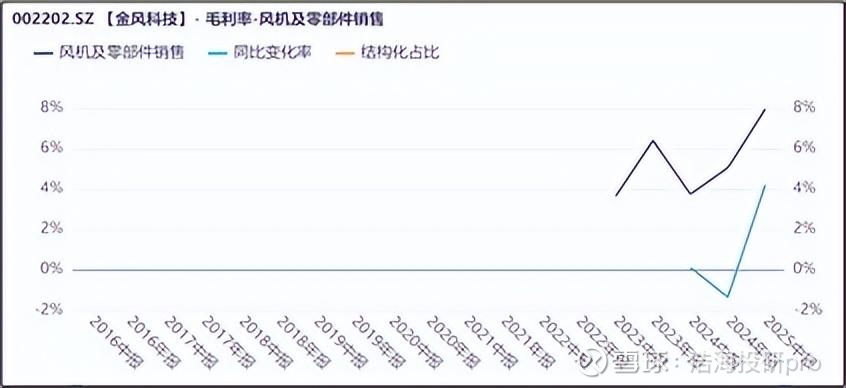 此外,为应对风电市场竞争,金风开始向“更高端”的大机型调整,大型化趋势带来单机盈利能力的提升。2025年上半年,金风占比最大的风机及零部件业务毛利率约8%,上涨幅度十分明显。