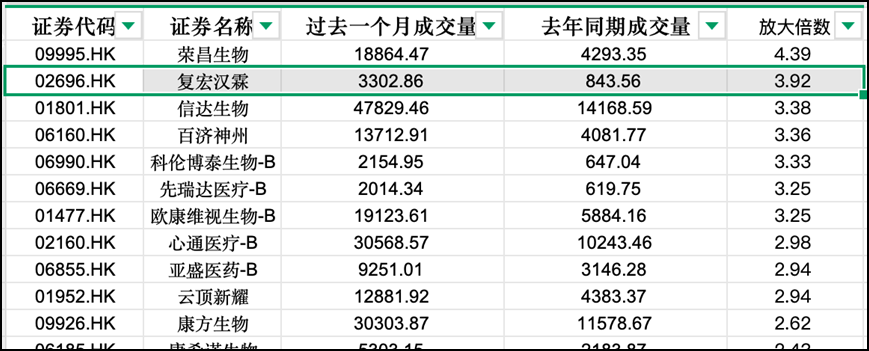 简单拉了组数据:过去一个月,复宏汉霖的成交量是去年同期的 3.92 倍。更关键的是,在同等规模的创新药企里,这个放量倍数远超信达生物、百济神州这些同行。能在同梯队中跑出这样的成交量增速,背后绝不是偶然的资金跟风。