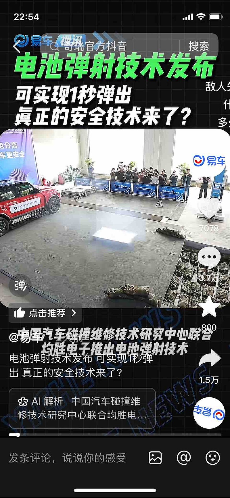 好消息,电池弹射技术来了,再也不用担心自己的车子自燃了。至于会不会烧到路人,那就不好说了。看了一个炸裂的新闻,中国汽车碰撞维修技术研究中心联合均胜电子,推出了电池弹射技术。该技术在电池热失控时,在一秒钟之内将电池弹出。$宁德时代(SZ300750)$ $比亚迪(SZ002594)$