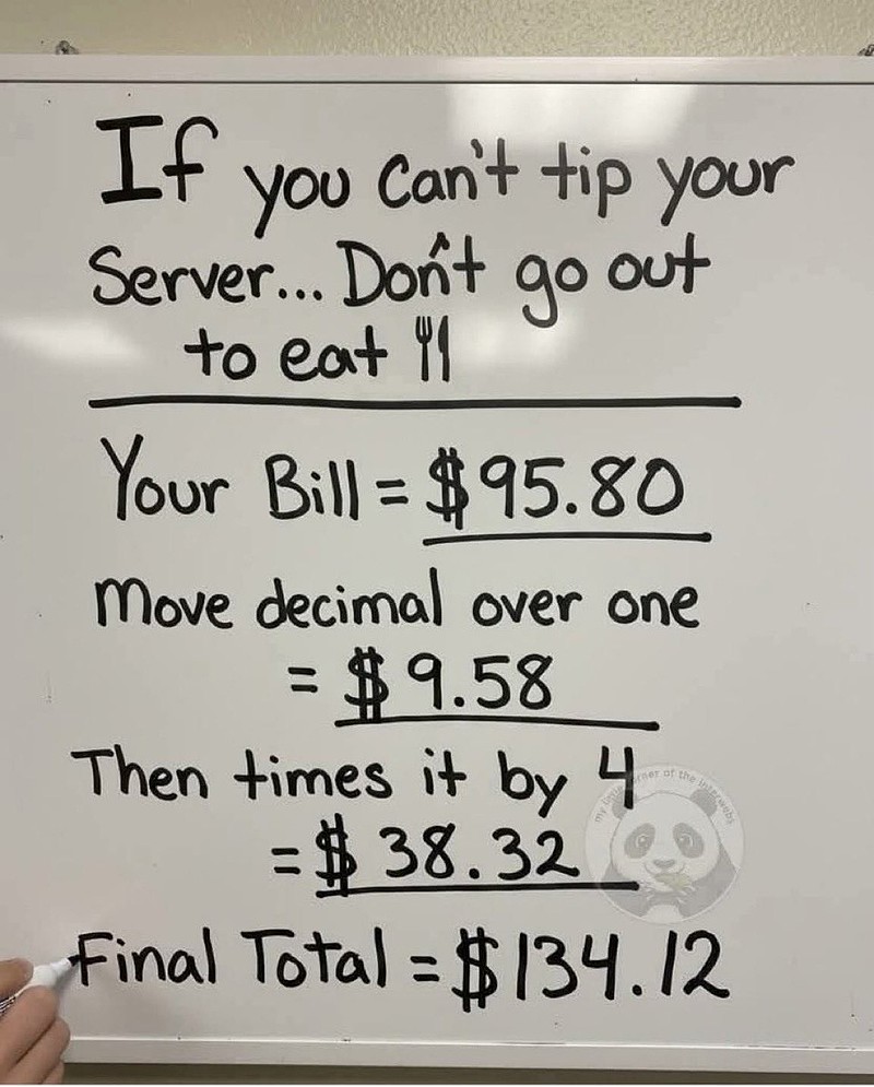 美国的小费也太逆天了。一家餐馆贴出公告:你的账单:$95.80先把小数点往前挪一位:$9.58然后乘 4:$38.32所以你最终就该付:$134.12听懂了吗?不想给小费,就滚回家自己做饭去!老板与员工的矛盾,转嫁成客户与员工的矛盾。$永辉超市(SH601933)$ $招商银行(SH600036)$