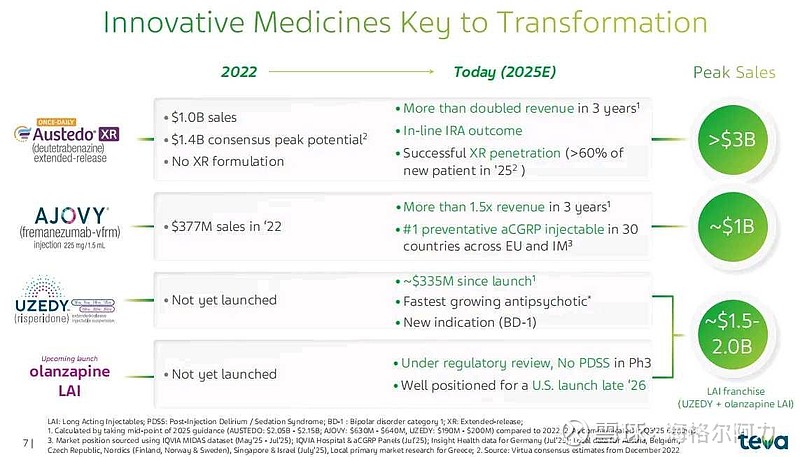 聊聊以色列梯瓦制药(Teva),作为全球最大的仿制药龙头企业,其仿制药和其他业务占比总营收一直在90%甚至超过95%(2025年总营收174.6亿美元)。一直到近几年在其三款主力新药营收高速放量带动下创新药物组合收入突破31亿美元(占比从2022年的9%快速升至2025年的18%),其三款创新药为: