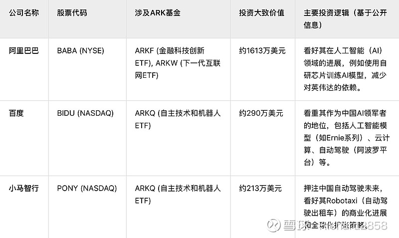 木头姐平时的交易较为活跃,上述信息主要反映2025年9月下旬的买入操作。其旗下基金的整体持仓和比例会不断调整,此列表并非其全部中国公司持仓,比如历史上前也曾投资过京东、腾讯、及拼多多等多家上巿公司。$阿里巴巴-W(09988)$ $百度集团-SW(09888)$ $小马智行(PONY)$