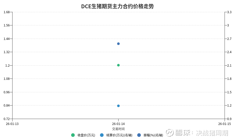 2026年1月14日,DCE生猪期货主力合约(Wind代码:LH.DCE)收盘价为1.201万元/吨,结算价为1.19万元/吨,当日振幅为2.5858%。