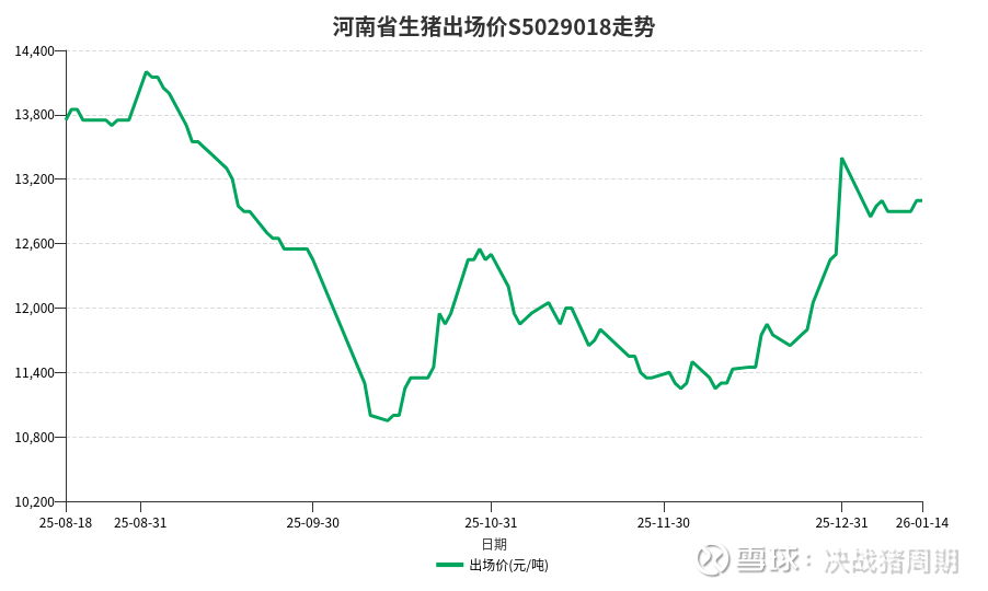 河南省作为生猪主产区,其出场价具有代表性。2026年1月14日,河南生猪出场价(外三元)为13000元/吨(即6.5元/斤),与全国平均价基本持平。