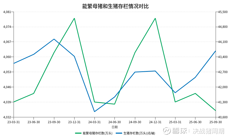 能繁母猪存栏量是影响未来6-10个月生猪供应的关键先行指标。最新数据显示,2025年10月中国能繁母猪存栏数为3990万头,同比下降2.1%。从历史数据看,能繁母猪存栏量自2023年达到峰值后逐步回落,目前处于相对较低水平。