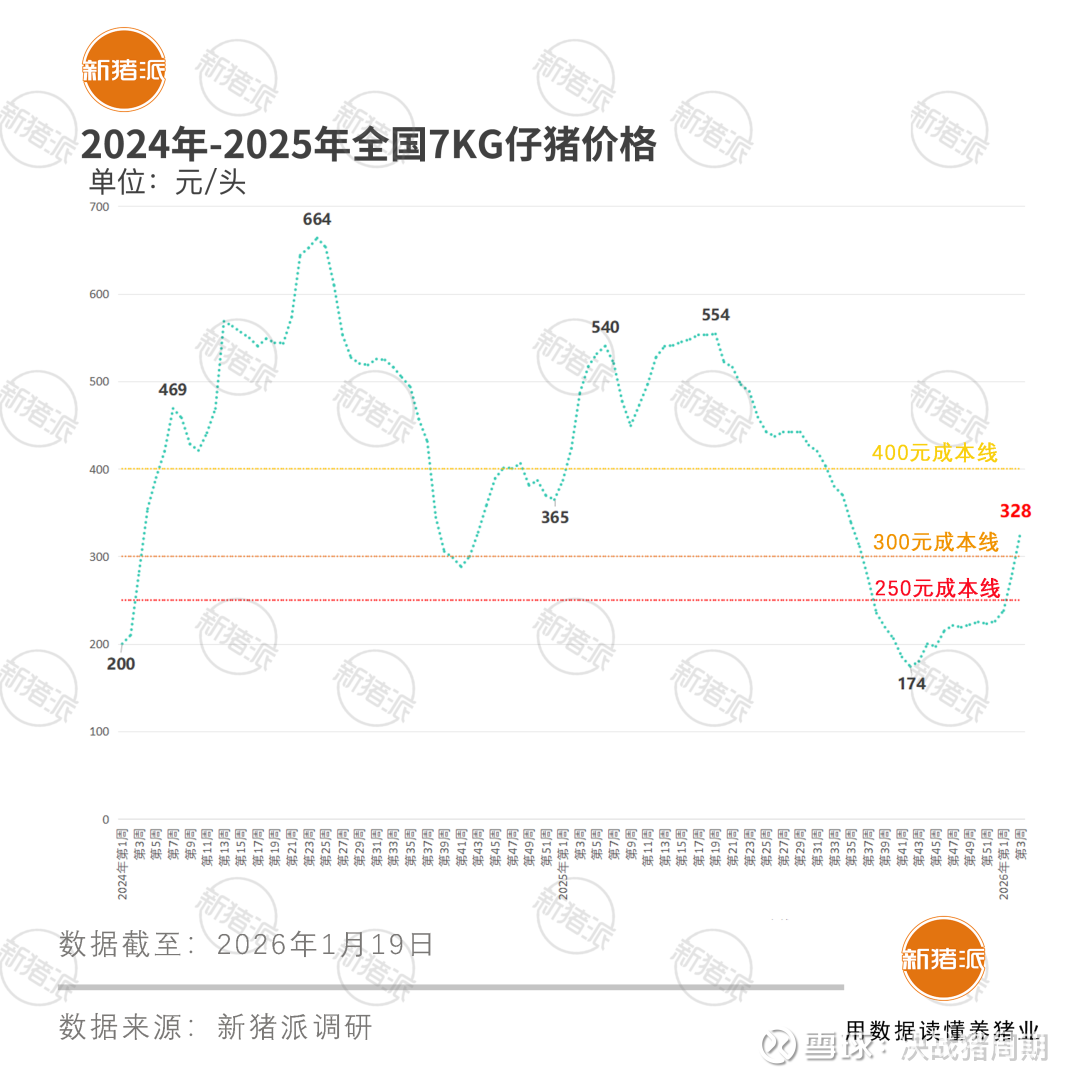 据新猪派调研,2025年10月中旬全国7KG仔猪价格跌至174元/头的近两年低点,之后逐步回升。从周度数据看,上周全国7KG仔猪均价为328元/头,环比上涨17.14%;尽管同比仍下降33.9%,但较去年低点累计涨幅已达85%,部分地区最新报价已超过350元/头。2026年开年后,仔猪涨势进一步加快,目前全国7KG仔猪价格较2025年末涨幅已达100元/头。