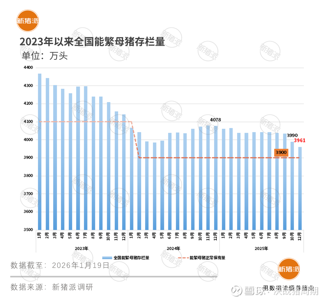 最新数据显示,截至2025年末,全国能繁母猪存栏量已从年初的4062万头降至3961万头,同比减少117万头,降幅达2.87%。回顾历史,2023年全国能繁母猪存栏量维持在4000万头以上,2024年开始逐步下滑,2025年加速去化。