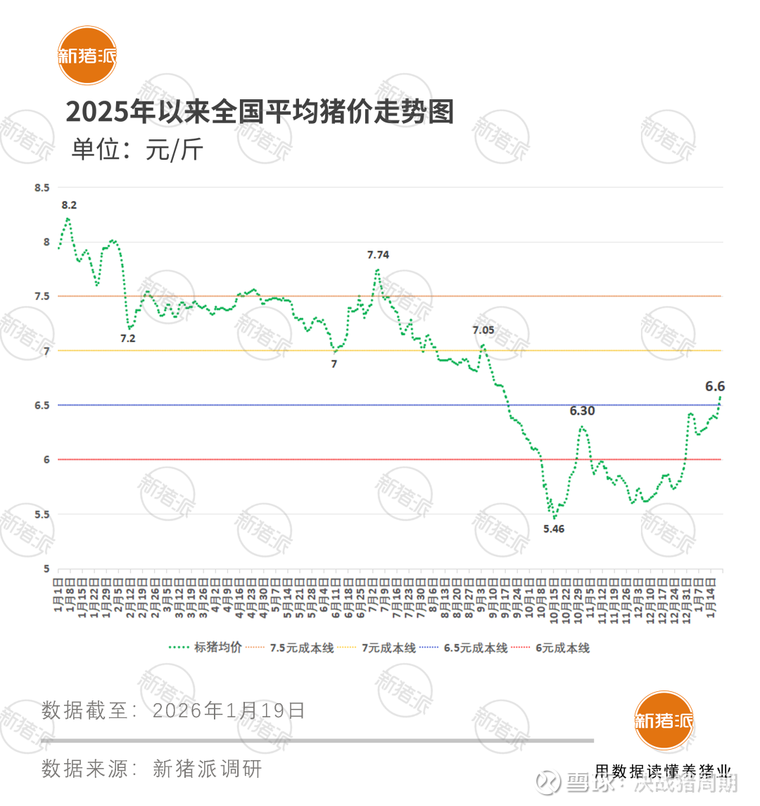 2026年1月,全国猪价摆脱持续震荡格局,进入快速上升通道。全国平均猪价已涨至6.6元/斤,主产区均价稳步攀升,主销区如广东、江苏等地多地突破7元/斤关口。