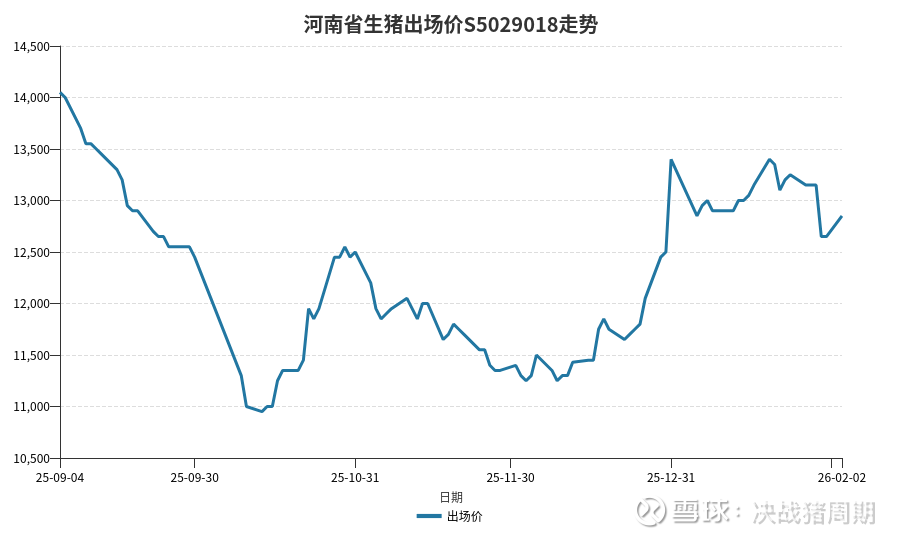 作为生猪主产区,河南省生猪出场价(外三元)2026年2月2日为12850元/吨(即12.85元/公斤),高于全国平均水平(12.48元/公斤),显示主产区价格相对坚挺。从近期走势看,河南省生猪出场价呈现先抑后扬态势: