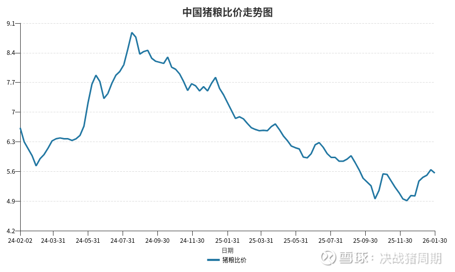 截至2026年1月30日,中国猪粮比价为5.56:1,处于较低水平。猪粮比价持续低于6:1的盈亏平衡点,表明当前生猪养殖处于亏损状态。从趋势看,猪粮比价自2025年7月以来呈现持续下降趋势,从7月初的6.23:1下降至当前的5.56:1,下降幅度约10.75%。