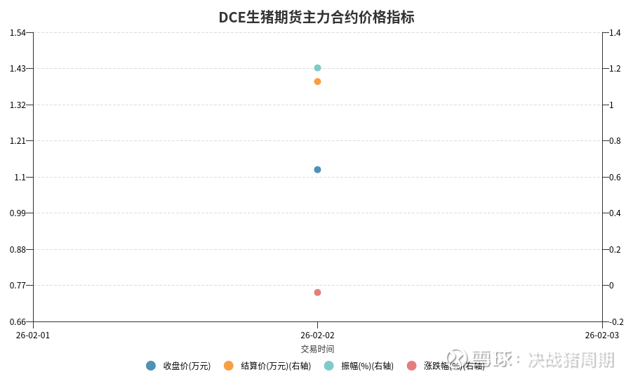 2026年2月2日,大连商品交易所生猪期货(Wind代码:LH.DCE)收盘价为1.122万元/吨,结算价为1.127万元/吨,当日涨跌幅为-0.04%,振幅为1.2032%。期货价格反映了市场对未来生猪价格的谨慎预期,与现货价格走势基本一致。
