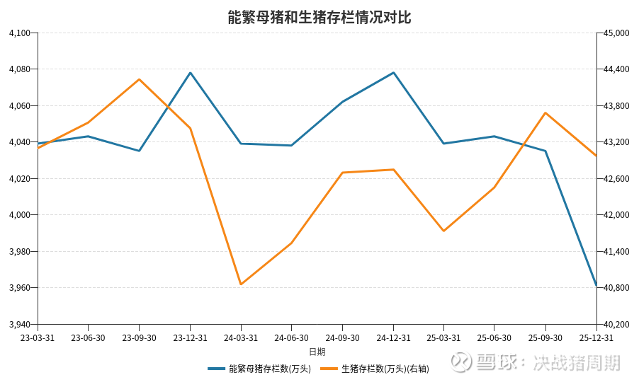 截至2025年12月31日,中国生猪存栏数为42967万头,同比增长0.5%。尽管能繁母猪存栏同比下降,但生猪存栏仍保持小幅增长,表明当前市场供应依然充足: