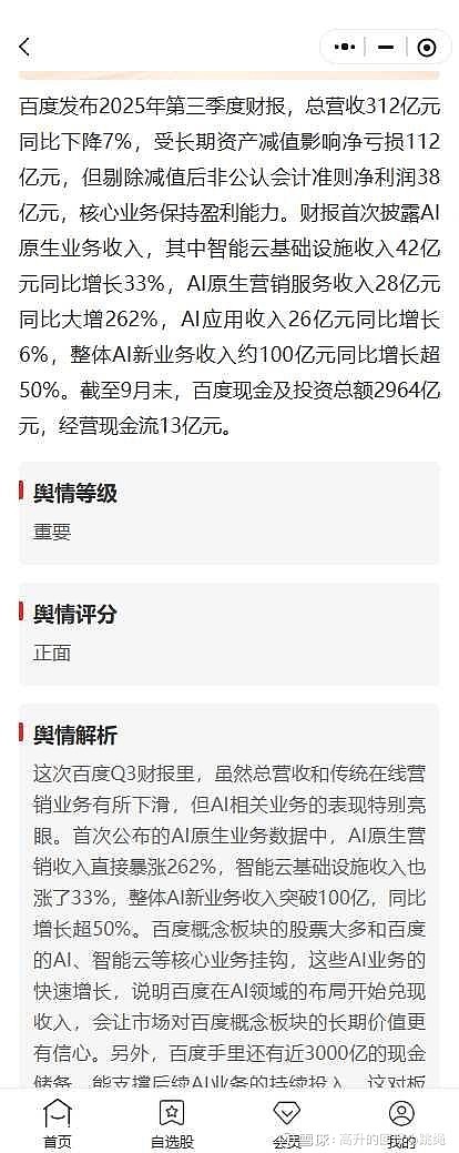 之前真的看不懂这些信息,但现在希财舆情宝上全有分析,看了眼关于百度三季报的分析:这次百度Q3财报里,虽然总营收和传统在线营销业务有所下滑,但AI相关业务的表现特别亮眼。虽然传统业务还在下降,但AI业务的爆发式增长是主要亮点,整体对百度概念板块是正面影响。