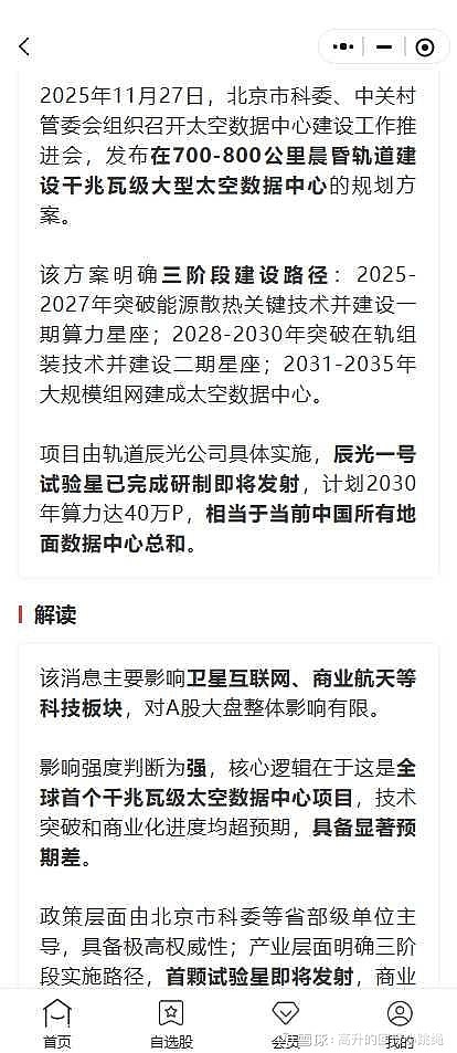 希财舆情宝一早就在风口解读分析了这件事:该消息主要影响卫星互联网、商业航天等科技板块,影响强度判断为强,核心逻辑在于这是全球首个干兆瓦级太空数据中心项目,技术突破和商业化进度均超预期,具备显著预期差。还提示了一些核心受益标的和方向。