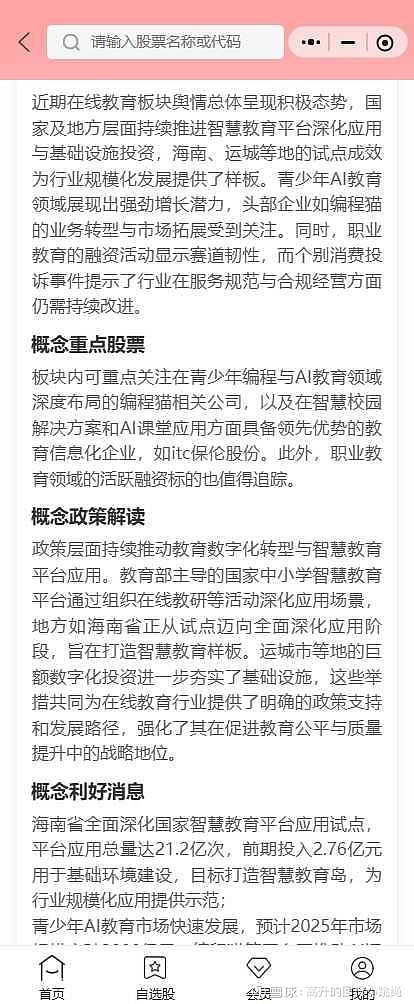 希财舆情宝对在线教育板块的评分给出了79分的正面,还盘点了机构观点:市场分析认为,资本在理性环境下更青睐具备标准化体系、聚焦清晰就业路径并能链接人才评价机制的职业教育企业,近期该赛道的成功融资验证了这一逻辑。同时,对于青少年AI教育,机构关注点从单纯的编程教学转向培养人工智能时代的核心创造能力,认为这与教育评价改革趋势相契合,具有长期成长空间。智慧教育方面,机构普遍认可国家与地方平台的持续投入与深化应用将为相关解决方案提供商带来稳定的业务增量。