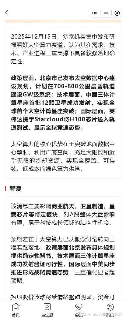在希财舆情宝风口解读看了分析,还准备跟踪看看上面提示的潜在受益股:主要影响商业航天、卫星制造、星载芯片等特定板块。预期差在于太空算力已从概念讨论转向工程实践落地,政策层面北京发布具体规划提供确定性背书,技术层面三体计算星座成功发射验证可行性,国际层面中美同步推进形成战略竞速态势,三重催化显著超预期。短期股价波动将受情绪驱动明显,资金可能从传统AI算力向太空算力延伸,形成新热点。