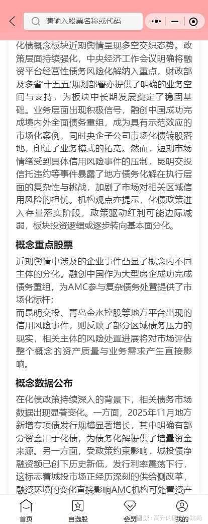 希财舆情宝上现在给的时60分的强中性分析:近期舆情呈现多空交织态势。政策层面持续强化,中央经济工作会议明确将融资平台经营性债务风险化解纳入重点,财政部及多省‘十五五’规划部署亦提供了明确的业务空间与支持,为板块中长期发展奠定了稳固基础。业务层面出现积极信号,融创中国成功完成境内外全面债务重组,成为具有示范效应的市场化案例,同时央企子公司市场化债转股落地,印证了业务模式的拓宽。机构对化债概念的中长期前景保持关注,但普遍提示短期政策驱动逻辑可能生变。