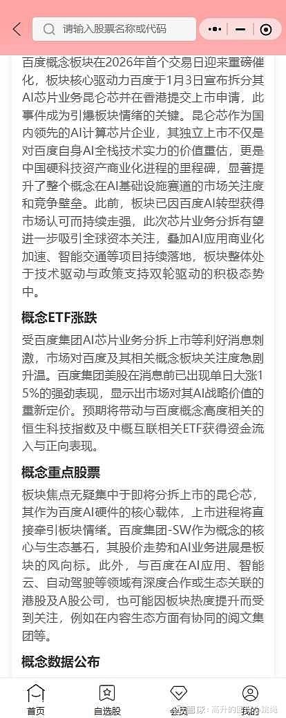 希财舆情宝上的最新板块分析有89分的强烈正面:昆仑芯作为国内领先的AI计算芯片企业,其独立上市不仅是对百度自身AI全栈技术实力的价值重估,更是 中国硬科技资产商业化进程的里程碑,显著提升了整个概念在AI基础设施赛道的市场关注度和竞争壁垒。此前,板块已因百度AI转型获得市场认可而持续走强,此次芯片业务分拆有望进一步吸引全球资本关注,叠加AI应用商业化加速、智能交通等项目持续落地,板块整体处于技术驱动与政策支持双轮驱动的积极态势中。市场机构观点普遍聚焦于百度在AI领域的全栈布局与技术领先性,AI应用商业化进程的加速也得到了机构的持续关注。 从舆情宝成分股榜单里面,