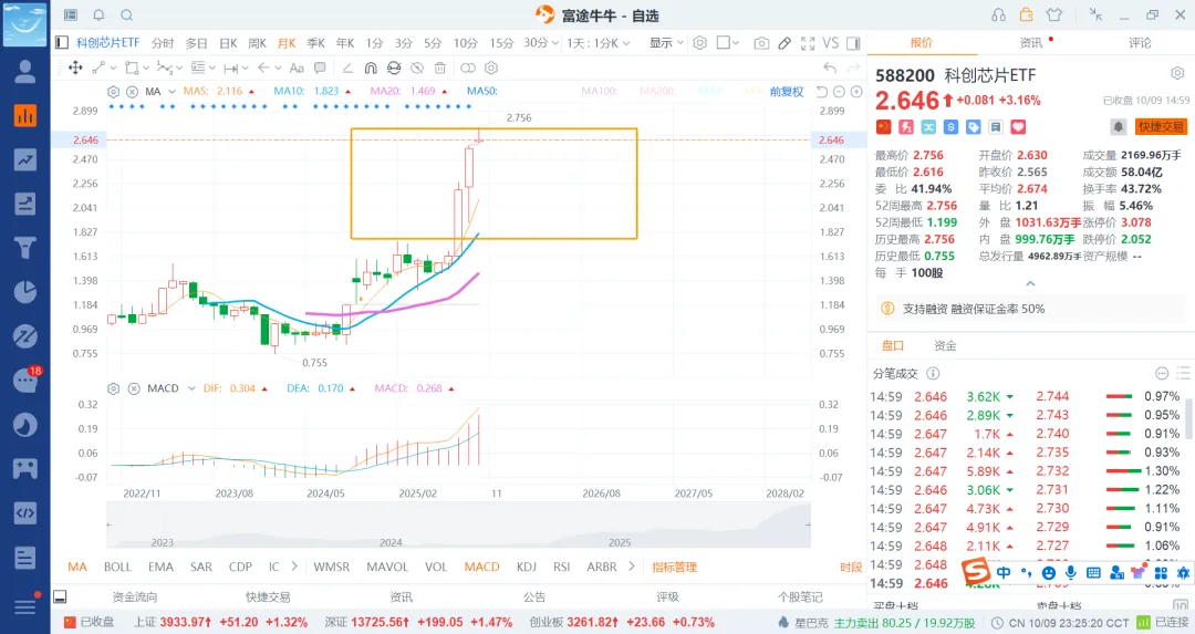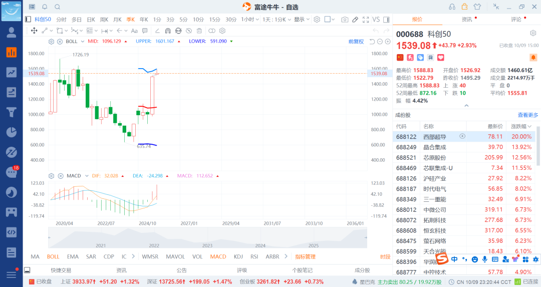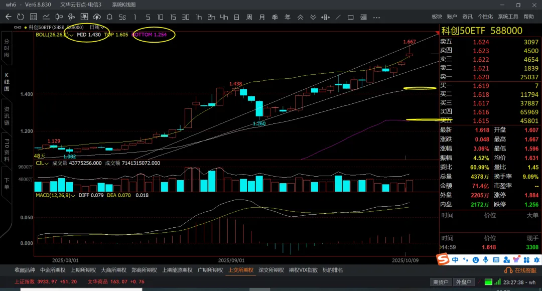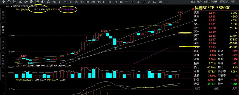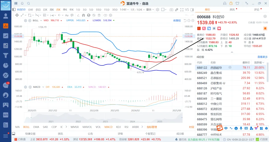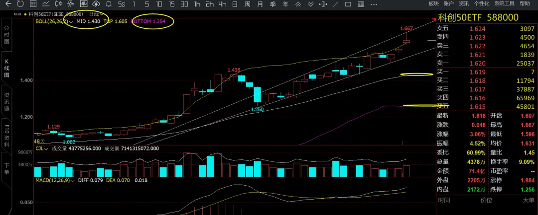 科创50三个破,一个是800,二个是1k1,三个是1k3了,现在给到1600/1650附近算是涨不少了,关键到了大压力位1700区域,而且是季度线从下轨走到上轨了。