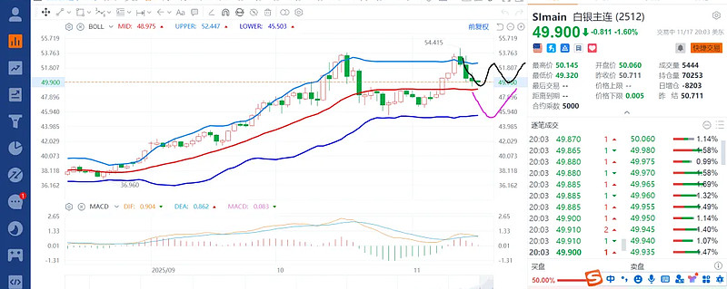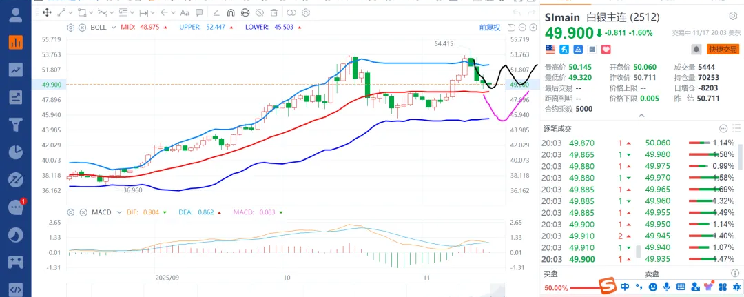 白银一个是在高位震荡,二个是跌回日boll带下轨,在上到中轨的震荡走势了,就看市场怎么选择了,但做空就很谨慎了,反而是做多没啥杠杆就不必担忧了,就看市场怎么给了,控制好仓位和节奏感就可以了。49/50附近稳住上方就是看52/53附近,稳不住就继续在46/47加多就是了,而且这里也是单独的加多位置了。