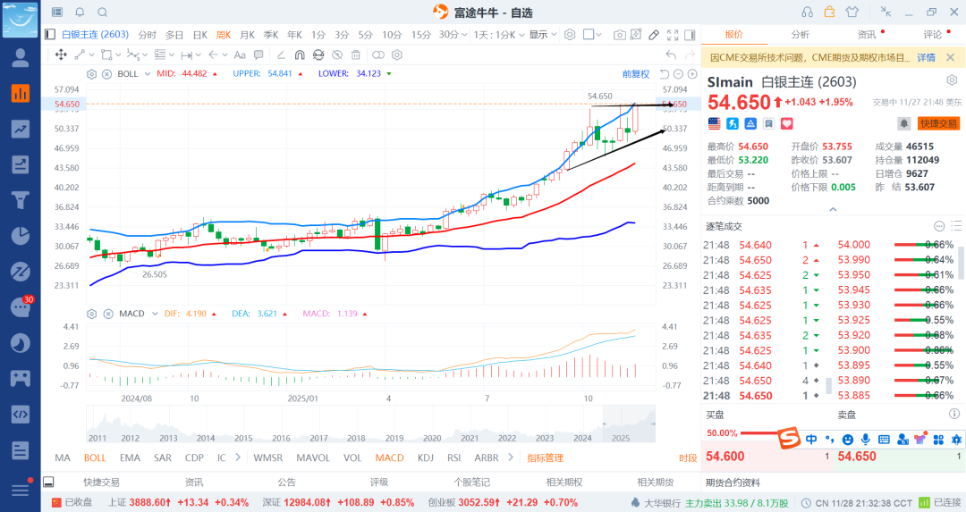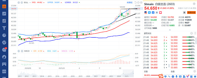 前面从白银突破了35/36区域就是直接看40/45附近,继续破就是50/55,后续在55/50附近持续震荡了一段时间,后续白银要是占稳了55/56则就是看60/65附近了,等待憋久后的突破了,持续震荡了一个半月的时间了,叠加cme交易所出问题,小心给你来个大的走势了,前面持续的在欧洲市场白银的库存持续减少,现在老美的库存也是如此,同时新能源和光伏的发展,其实ai也是对白银的需求越来越大了,未来机器人等等,都是需要焊接点,同时矿的开发延后了,持续的供应跟不上需求,白银是贵金属和工业属性双重,现在是白银工业属性越来越强了,叠加库存的减少,是很容易出现逼仓的走势行为了,尤其是华尔街喜欢做空贵金属,因为贵金属是美元天然的敌人,这样出现了大机构的对立,也就是逼空走势是很被动了,cme的停牌也可能是这样,因为之前游戏驿站就是如此,同时老美的经济就业不太行,12月降息的概率又大增,白银的趋势有走出了大趋势,基本面,供需,库存,投机,多空对决等都在一块了,那么就很容易走出大行情了,之前是看调整一段时间,也确实调整了,现在继续给你上走,自然就是按照策略节奏来做了,不走趋势就震荡回调到重要均线做多就好了,先看震荡偏多走势,而且如果突破了震荡区域,自然就是追多了,当然存在失败的可能性但很小了,这点风险还是要承受的呢,后续占稳了55/56起步都是60附近,多一些就是65/64左右了,未来要是出现华尔街倍逼仓走势,到80/100也是很大概率,同时白银的金银比很高了,历史上是可以走低到40/60区域,这样看白银还是低估了,相对于黄金来说了,而且贵金属大牛市后半段都是白银比黄金强多了,趋势走出来了就是上不封顶,同时历史新的新高走势,谁也不知道,就算算未来白银走涨到100轻轻松松,到200-300也不是不可能的呢,比如黄金到5k-1w,白银金银比60就是了。
