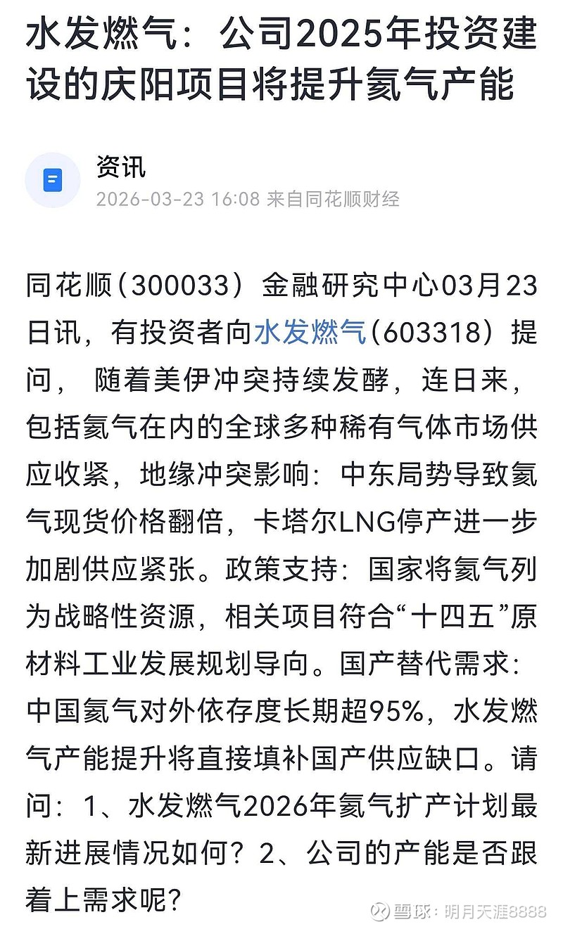 随着美伊冲突持续发酵,连日来,包括氦气在内的全球多种稀有气体市场供应收紧,地缘冲突影响:中东局势导致氦气现货价格翻倍,卡塔尔LNG停产进一步加剧供应紧张。政策支持:国家将氦气列为战略性资源,相关项目符合“十四五”原材料工业发展规划导向。国产替代需求:中国氦气对外依存度长期超95%,水发燃气产能提升将直接填补国产供应缺口。